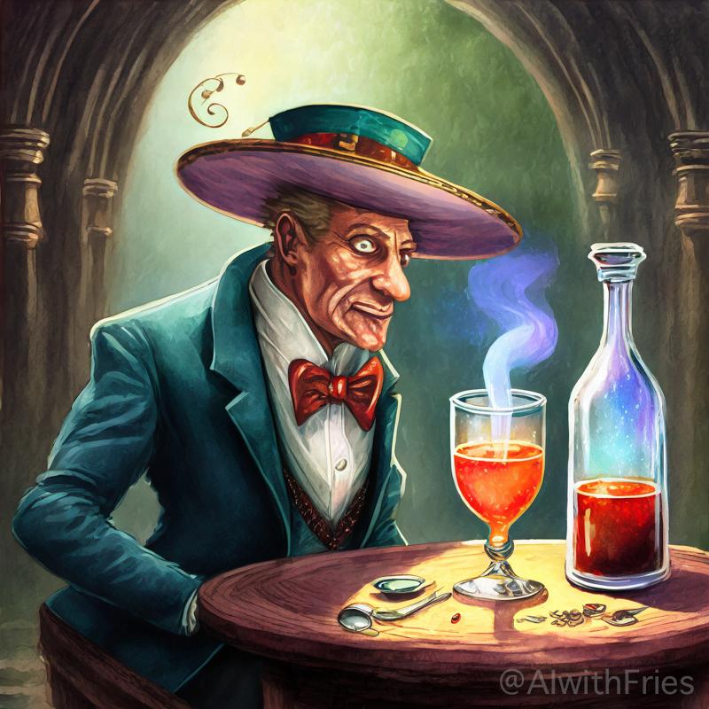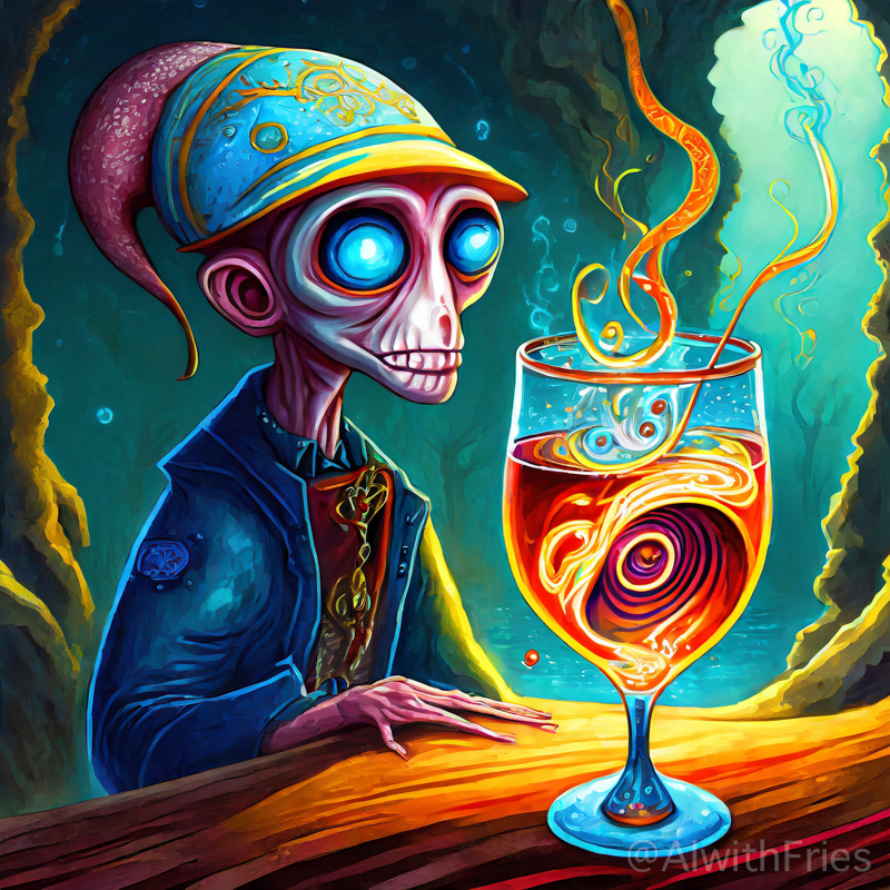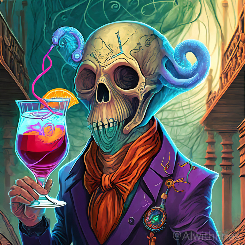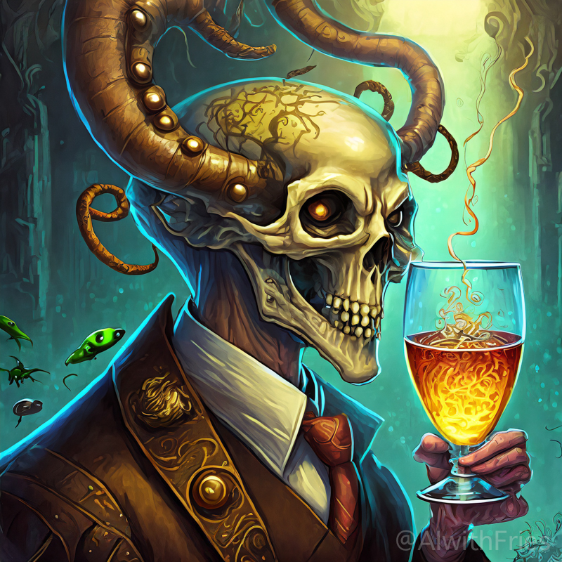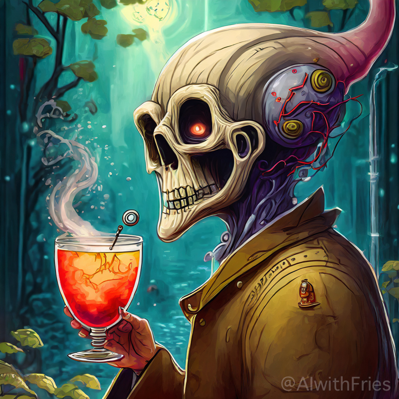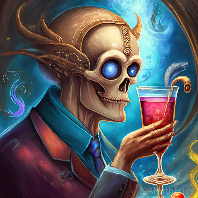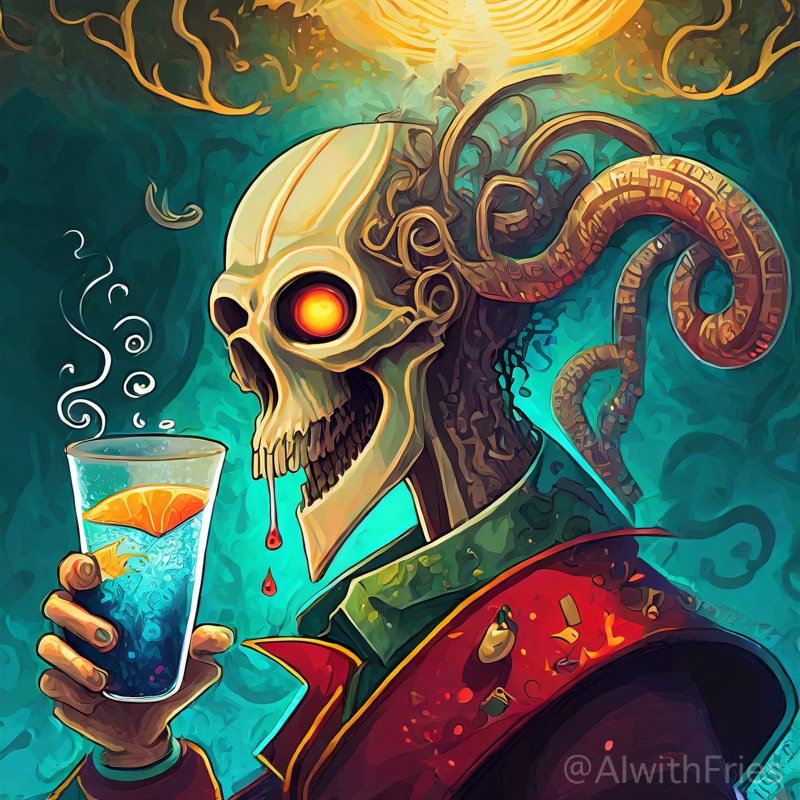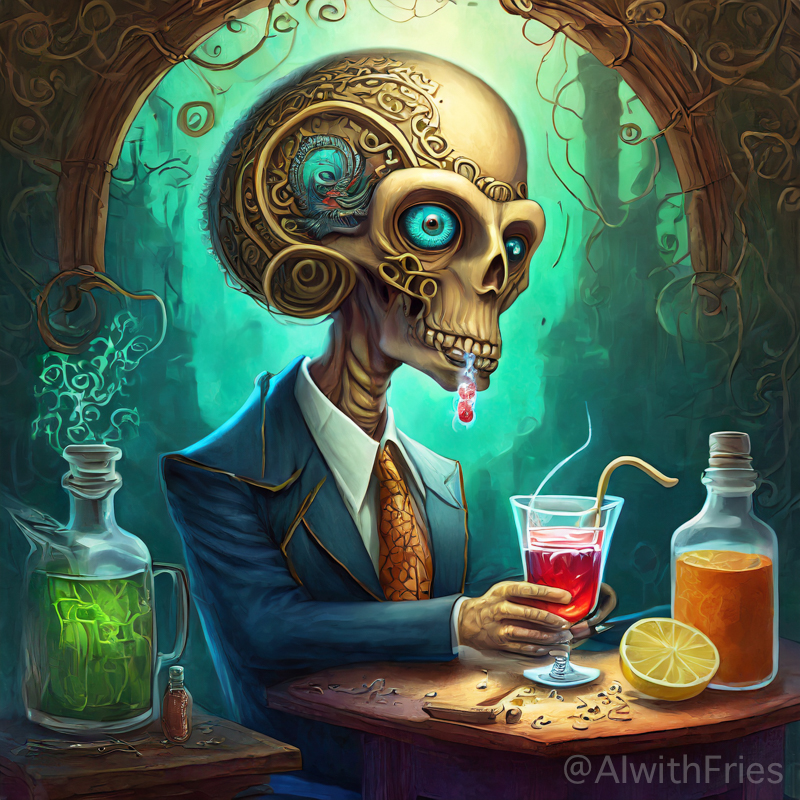 The bartender poured a concoction that shimmered with an otherworldly hue into a glass chiseled from solid despair. I took the drink and turned to survey the patrons—each one a story of downfall and defeat. There was the gambler, eternally raising his glass in a toast to fortunes never won; the seductress, her beauty marred by the scars of treachery; and the poet, scribbling verses that would never see the light of day.